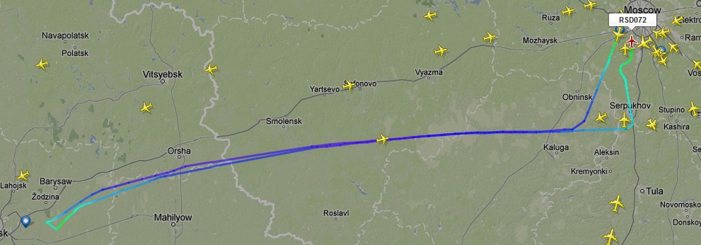 В районе Курска начал расчетное снижение (эшелон 340), в районе Белгорода пропал с радара и перешел на 129.250 (уже в шумах примерно на 3 балла, т.к. эшелон 200).