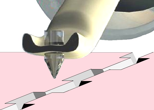 Для пущей наглядности я даже изобразил дорожку с идеальным меандром на розовом виниле (схематично; извиняйте, если не в масштабе). Чё будет, когда игла вздумает пойти по такой дорожке?