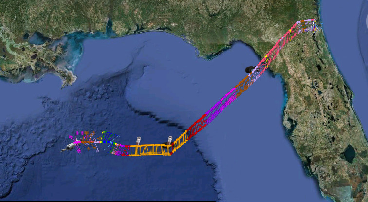 Он-лайн схемы работы по сбросу зондов и съёма с них информации на настоящее время 2-х WC-130 и одного WP-3D по урагану.