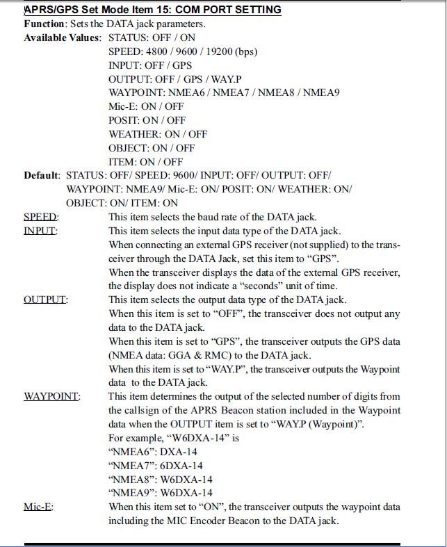 Кстати, VX-8GR умеет еще по COM-порту принимать координаты от внешнего GPS'а. Таким образом, раз уж все-равно будет внешний GPS и соединение с ним, то можно отключить встроенный в VX-8GR и тем самым экономить заряд аккумуляторов (хотя и незначительно).