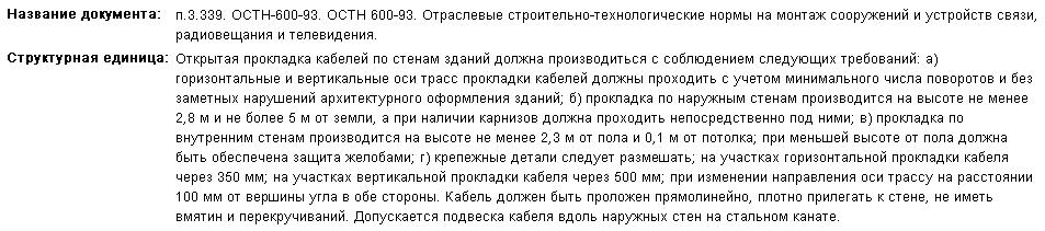 Подрядчик произвел монтаж фидера по наружной стене здания от антенны, установленной на крыше до помещения, где установлена стационарная УКВ радиостанция. Подскажите, какими нормативными документами можно обосновать, что провисание фидера не допустимо и надо прокладовать внутри здания.