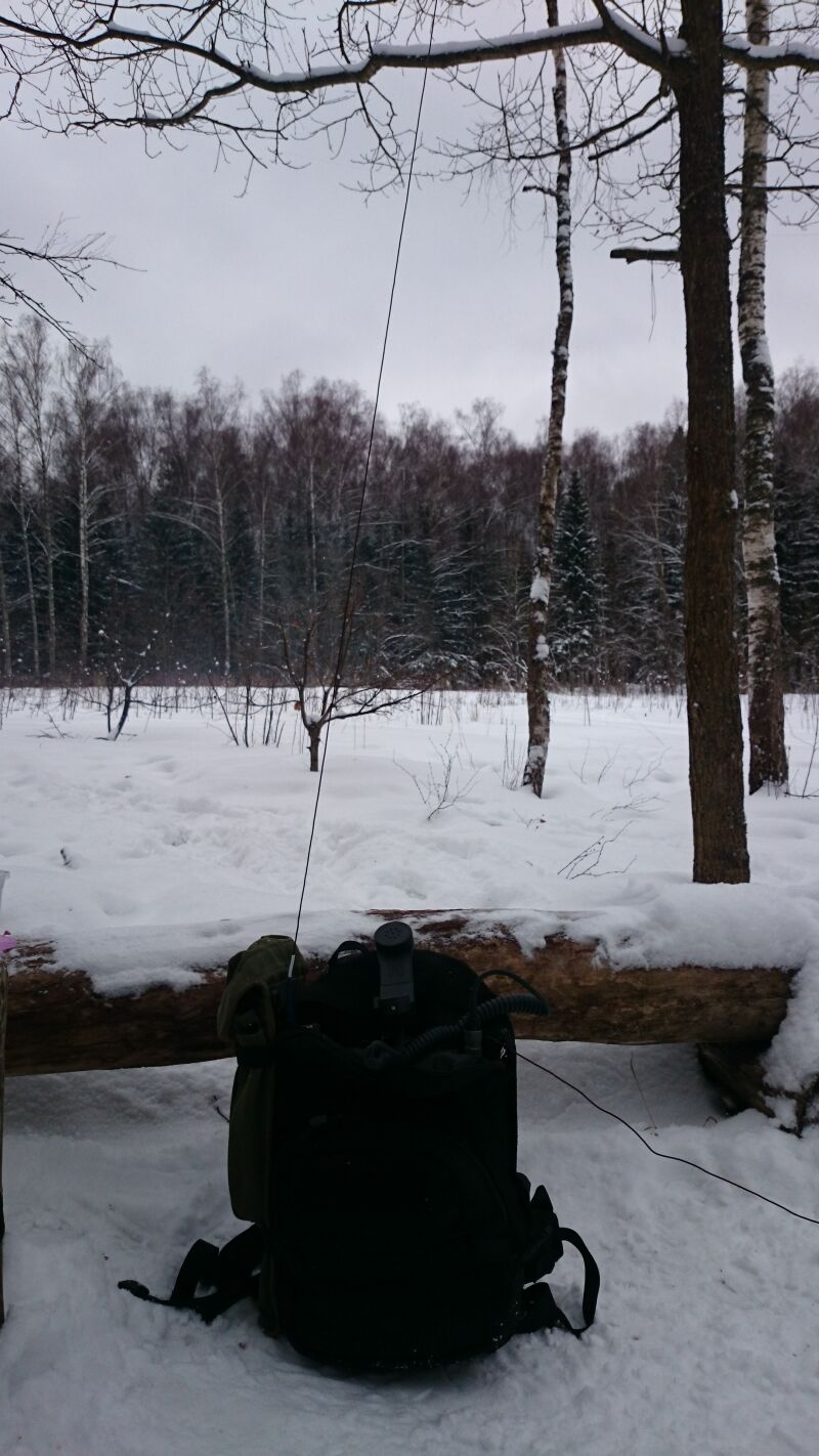 Несколько фото из леса - окружающая действительность и фото с привала, видна аварийная проволочная антенна, уходящая почти вертикально вверх и противовес, лежащий на снегу и кустах.