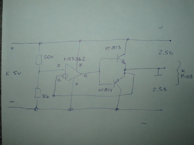 Найдена была принципиальная схема: Где была найдена схема, вызывающая сомнения... Автору ее все равно,германиевые или кремниевые диоды использовать ! (в цепочке из 5 шт). Судя по номиналу R2 300 Ом,этот БП обеспечит равенство плюс и минус 2,5 в при токе около 8-10 мА., не более. Сколько надо для 105-й не знаю, но имхо намного больше. Трансформатор подойдет, если 105-ка будет просить ток порядка пол ампера. Схема в принципе правильная, за исключением рекомендации примененных диодов (или их количества)в последовательной цепочке. На печатной плате ошибка -попутана полярность выпрямительного моста. И еще рекомендация -расположить диоды в цепочке не так, как солдатики, голова к голове, а валетиком, будет удобнее. Ну это не принципиально.