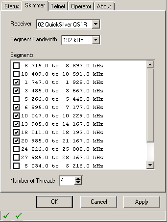 В разделе “Skimmer” в поле “Reciever” выбираем QS1R, в поле “Segment Bandwidth” выбираем нужное для задач значение, у меня по умолчанию там выбрано 192 kHz, если компьютер слаб, то можно выбрать меньшее. В полях “Segments” проставляем галки там, где необходим мониторинг. У себя, как правило я выбираю днём 7, 10, 14, 18, 21, 25, 28 MHz, ночью 1,8, 3, 7, 10, 14, 18, 21 MHz. Можно выбрать любые бэнды, но не более семи.