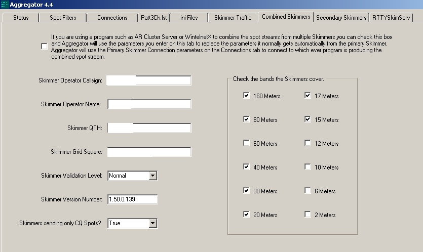 В разделе “Combined Skimmers” заполняем поля с личной информацией, как мы это делали в Skimmer Server, проставляем галки в нужных сегментах бэндов, соответственно с настройками скиммера