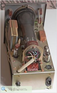 Таки, да - ИН-13. И высокое напряжение есть - несколько раз долбануло, причём совершенно неожиданно. Три электролита уже заменил. Противный звук пропал. В динамике нормальный шум ненастроеного на станцию приёмника. Настроиться пока не удалось. Но длина светящейся полоски на "шкале" меняется. У аппарата довольно стильный внешний вид и интересная конструкция антенны. Схема до сих пор не найдена.