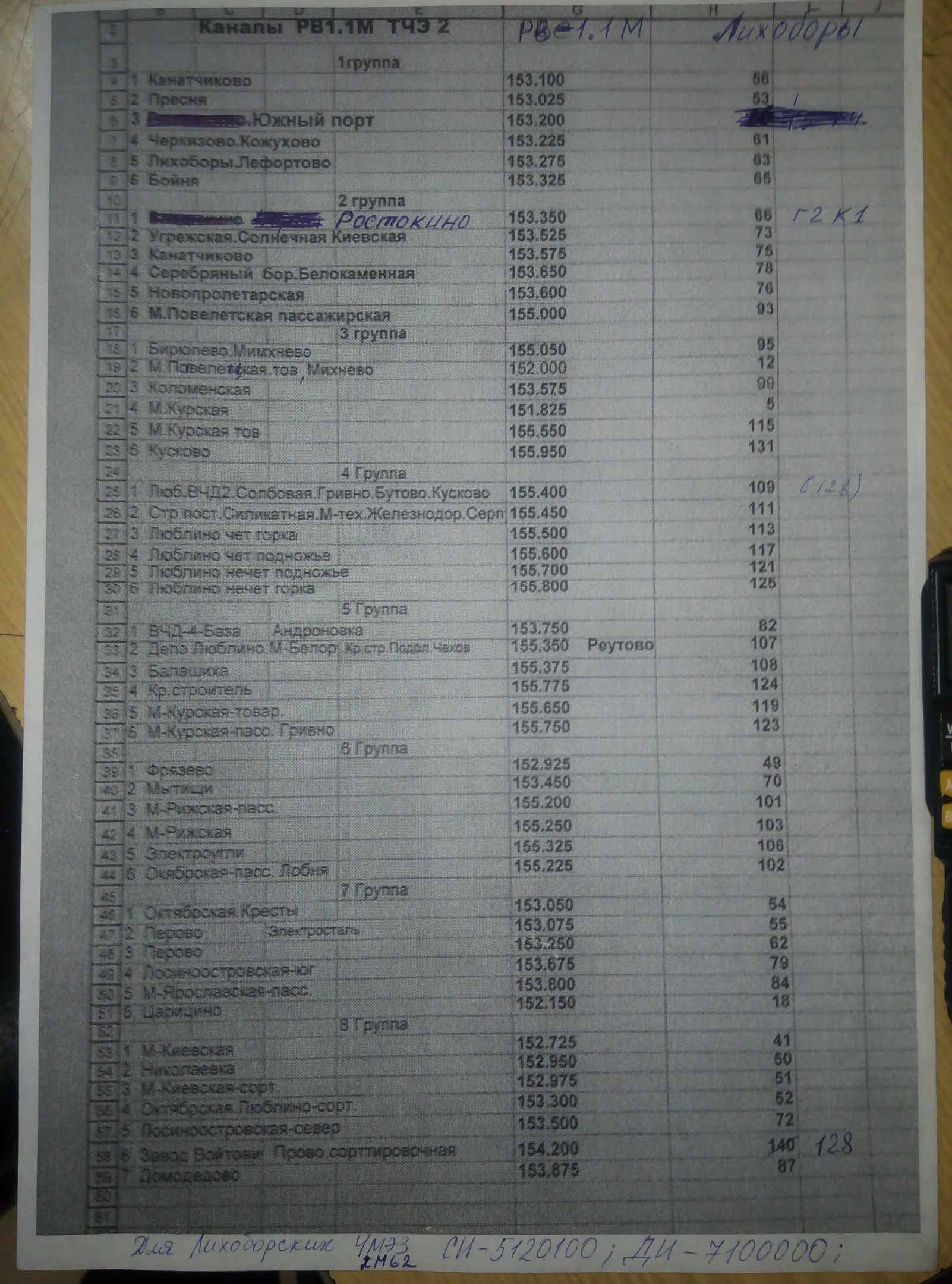 Мои 5 копеек в тему - подсмотренная в маневровом локомотиве таблица каналов и частот маневровой и поездной радиосвязи Горьковского направления Московской железной дороги: