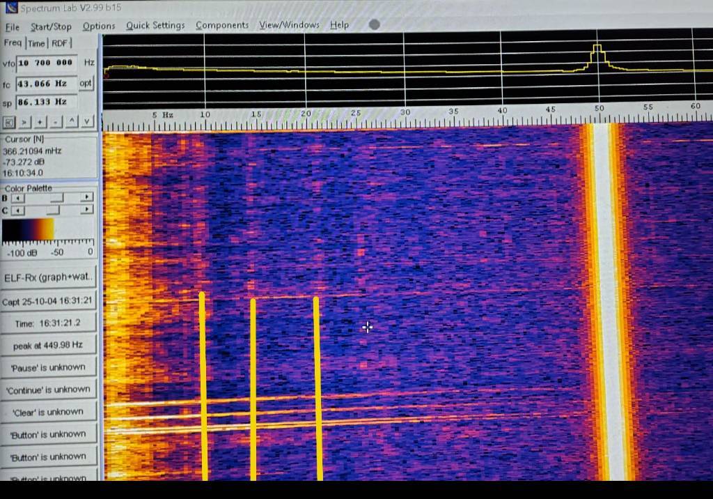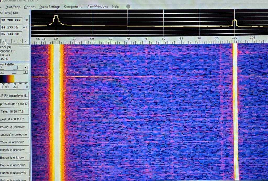 Также удалось увидеть резонансы Шумана 7.83 Гц, 14.1 Гц, 20.3 Гц. И трассу передатчика Зевс на 82 Гц . Крайне низкие частоты. Место шумноватое, но накоплением сигнала видно. Антенна вертикал 10 метров.