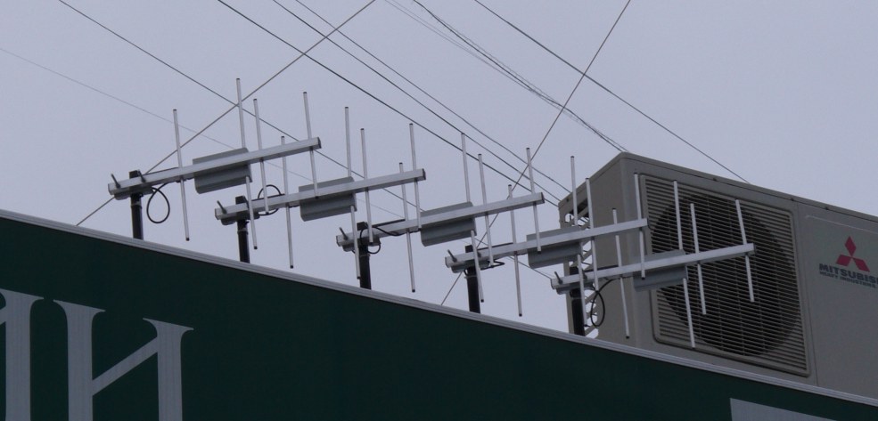 Над отделением сбербанка с давних времен стояла видимая на снимке коллинеарная антенна. Недавно рядом добавили несколько направленных антенн.