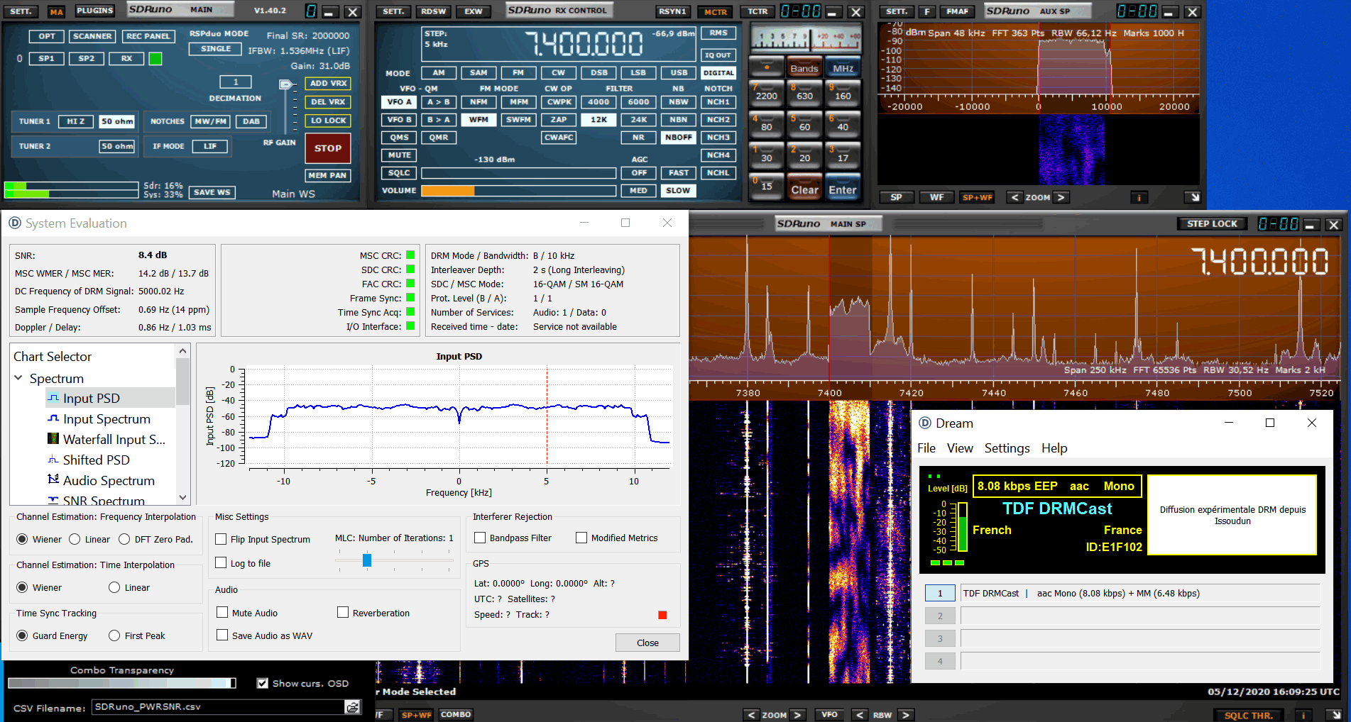Записал фрагменты приёма тестового вещания TDF DRM на частотах 11735 кГц (13:00 UTC), 9905 кГц (в 15:00 и 17:30 UTC) и 5875 кГц (23:30 UTC). Помимо аудио удалось принять мультимедиа DRMCast. Была передана картинка "радио в металлической коробке", текстовый файл в формате .txt (Expйrimentation DRMCAST pour TDF) и ещё шесть картинок, которые я не могу открыть. Эти шесть картинок сохранились в папке METEO, возможно, это картинки метео факса? В качестве приёмника использовался RTL-SDR v. 3, декодер DREAM 2.1.1. Антенна - провод 5 метров за окном. Приём осуществлялся в условиях многоэтажного дома, г. Витебск, Беларусь.