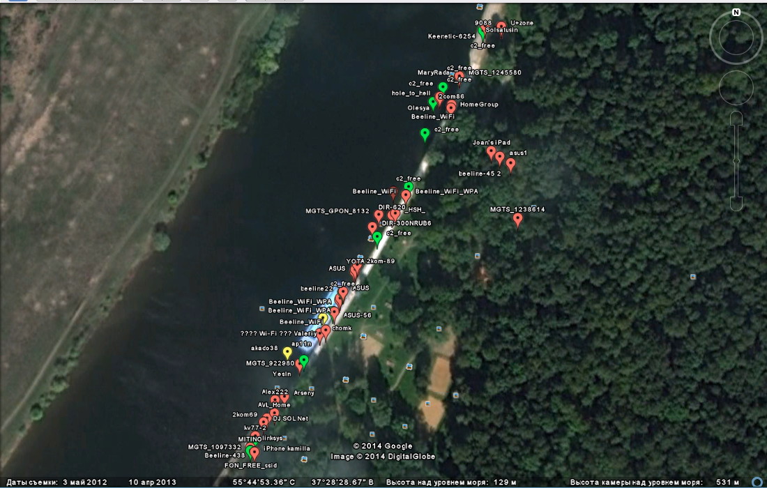 Погулял в Филёвском парке, по набережной, до ближайших жилых домов наверное минимум километр, принимается довольно много сетей, правда уровни -85..-90дБм.