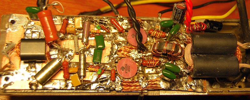 При настройке Вых.каскада полезно иногда контролировать напряжение смещения на базе ( через ВЧ дроссель), он должно быть положительным :).