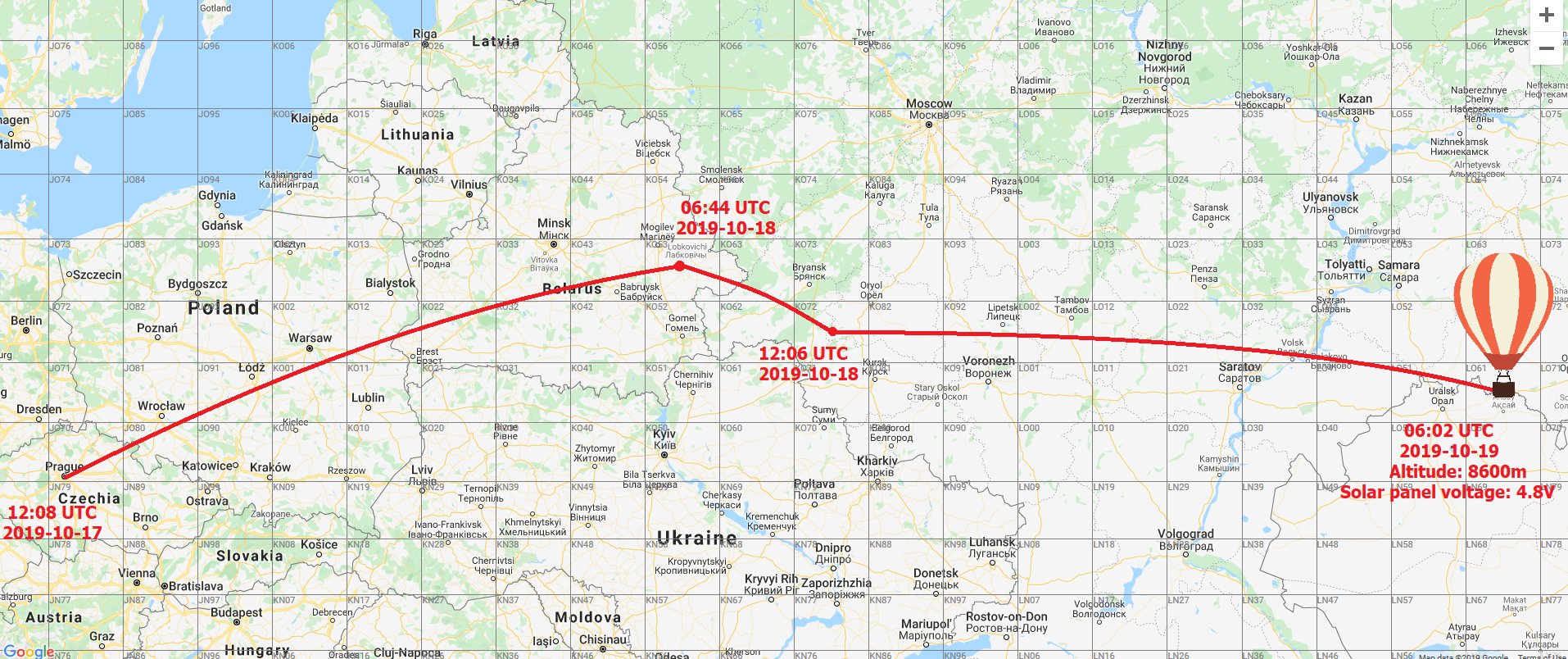 ... Последний трек в 06:02 UTC составлял 8600 метров, и с тех пор их никто не слышал. Частота 7.0386 Мгц, мощность 10 Мвт. Мода WSPR. Позывной: OK1RAJ.