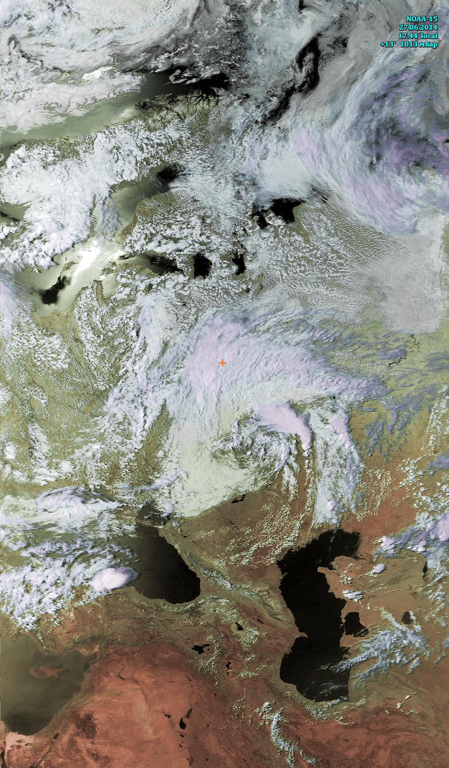 Действительно, в плане функциональности на данный момент Wxtoimg превосходит все остальные имеющиеся в открытом доступе декодеры. Помимо всего прочего она позволяет наносить на снимок подробную сетку с городами, реками и т.д. Такие картинки наиболее востребованы, учитывая обширную географию участников и гостей форума, т.к. легко позволяют найти свое местоположение. С другой стороны, искусственно нанесенные программой объекты в какой-то степени "засоряют" оригинальную картинку и зачастую не позволяют увидеть некоторые довольно интересные детали. Собственно, чтобы найти компромисс, вешаю здесь два снимка: один - от SatSignal (приятная для восприятия цветовая схема и максимально "чистый" снимок), второй - от Wxtoimg - с городами и границами.