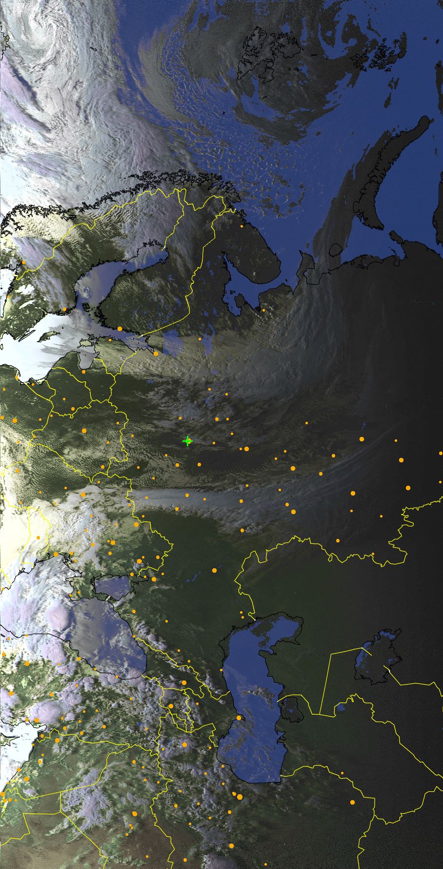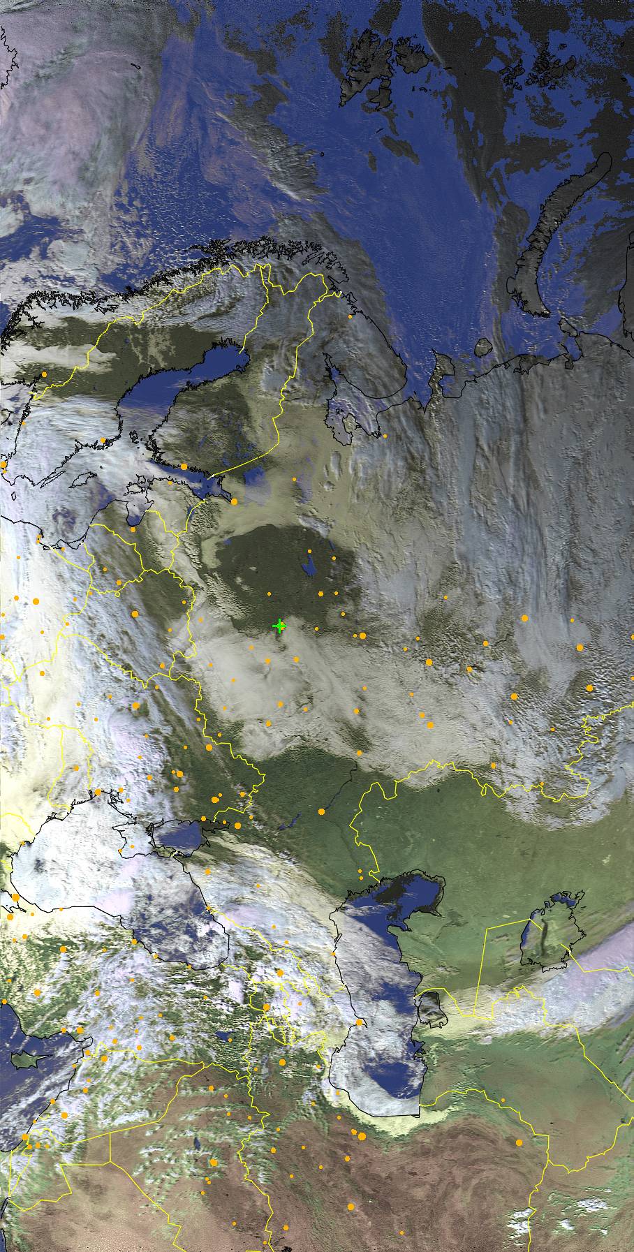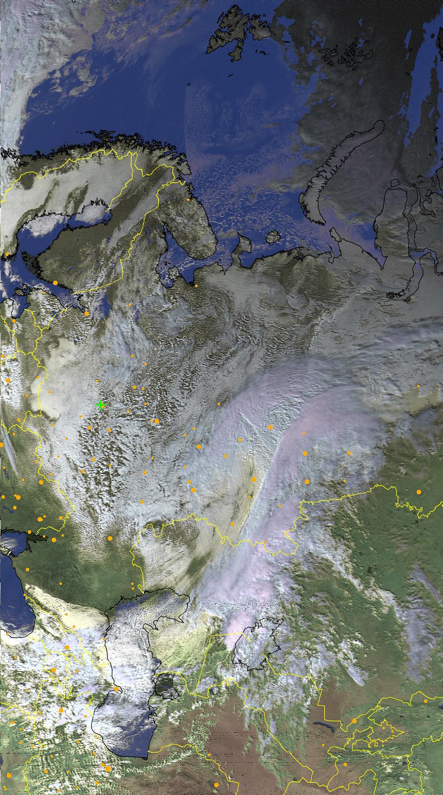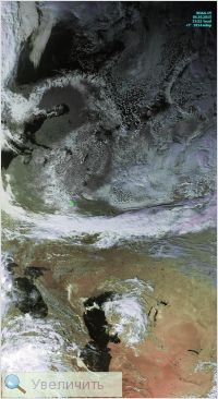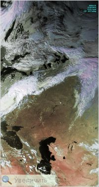 Главный действующий герой на снимке - уходящий на восток циклон, припорошивший снегом Кольский п-ов. В его тылу распространяется холодный арктический воздух, продвижению которого вглубь Европейской части страны будет способствовать еще и восточная периферия скандинавского антициклона Oldenburgia.