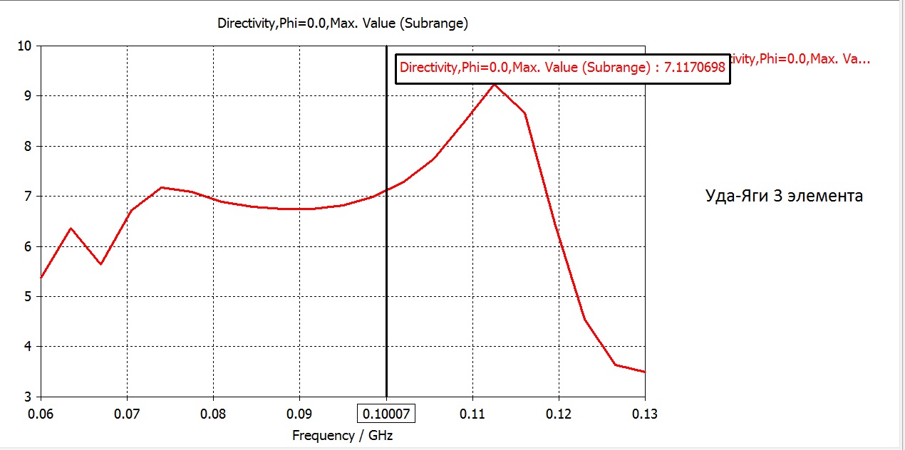 Как то разрабатывал антенну для ФМ радио. Усиление в полосе частот такое см. скрин: Трёх элементный волновой канал. |