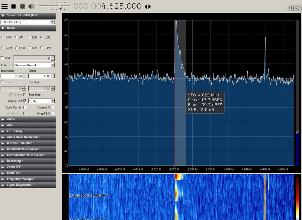 Вот в данный момент Buzzer 4625 слышно. Кстати АМ морзянка на 4651 более отчётливо принималась на LoG. По спектру тоже заметно. Так же как и "Гусь" на 4310.