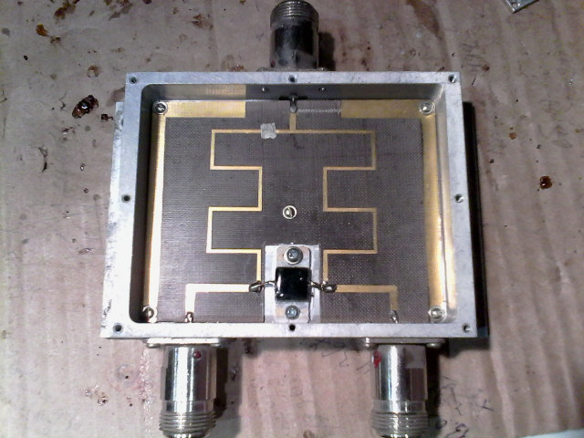 Судя по виду это сумматор для работы двух передатчиков на одну антенну. Чёрная деталь - резистор на 160 Ом. Сам сумматор выполнен на полосковых линиях, судя по всему на UHF диапазон.
