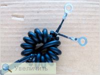 Далее - "балун", его ещё называют "стакан". На ферритовом кольце из Чип-и-Дипа диаметром 40 мм М2000МН намотал 2х5 витков RG-58. Как мне уже подсказали - это мало, лучше 2х7 витков. И сделал такой вот девайс, верх которого крепится на удочке, а низ лежит уже в помещении, и к нему подключается приёмник SDR.
