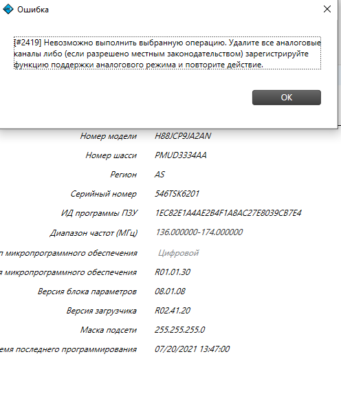 Всем доброго время суток! Попала в руки motorola sl1r. Привезли из китая.Пытался поменять на ней частоты с помощью cps2.0. При записи в устройство выдает сообщение: "Невозможно выполнить выбраную операцию. Удалите все аналоговыеканалы либо зарегистрируйте функцию поддержки аналогового режима и повторите действие" Может кто сталкивался?