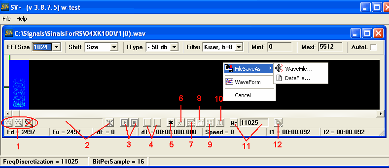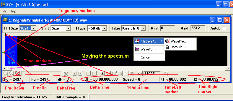 Если в области отображения спектра(не только на самом спектре) кликнуть правой кнопкой мыши, появится PoupUp Menu в котором два рабочих пункта FileSaveAs и WaveForm, первый позволяет сохранить результаты или как wav файл или как Data(просто 16 битные отсчеты), второй просмотреть и провести некоторые измерения по форме сигнала.