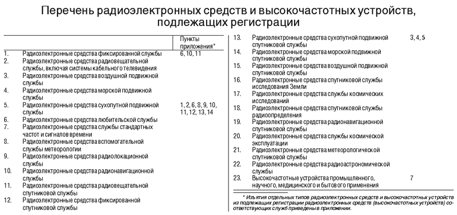 перечень радиоэлектронных средств и высокочастотных устройств, подлежащих регистрации.