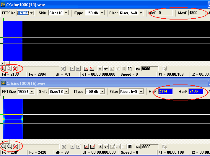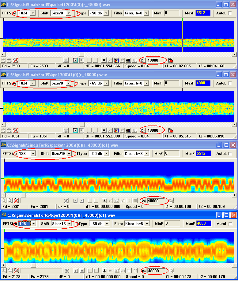 Красным выделены места на которые нужно обращать внимание в первую очередь, по последним спектрограммам видно, что в принципе дальнейшая игра размерами и сдвигом блоков мало чего дает, понять что именно и где, весьма затруднительно, начинает сказываться недостаточная разрешающая способность по времени, есть ли способы эту ситуацию изменить? Есть, хотя это и напоминает попытки обмануть реальность, но в каких то случаях и этого уже достаточно. Речь идет о повышении частоты дискретизации, на некоторых сайтах выкладывают спектрограммы с безобразным разрешениеми, и видно, что даже в голову не приходило ситуацию хоть как то улучшить. В общем случае повышение частоты дискретизации приводит к тому, что конечные временные отрезки сигнала занимают значительно большее количество отсчетов, что адекватно увеличению разрешения по времени, а именно этот параметр не дает увидеть тонкую структуру сигнала. Увеличим частоту дискретизации обоих сигналов ну скажем до 48000 Гц, воспользовавшись ресемплером.