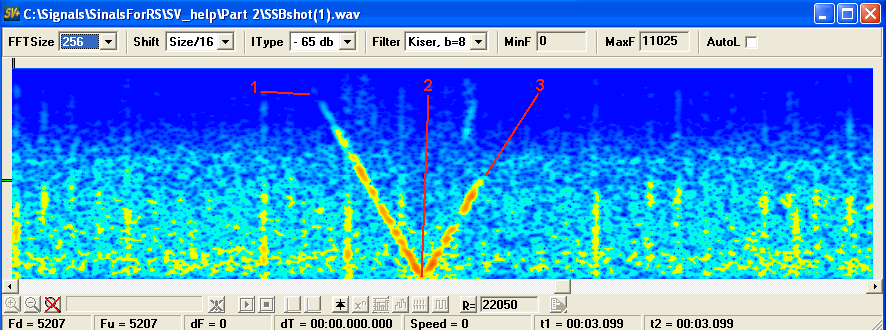 Не знаю как у кого, но у меня места отмеченные цифрами вызывают сразу повышенный интерес, типа, а с чего это вдруг именно так? Те кого картинка оставляет равнодушной, явно напрасано теряют время. ;) Начинаем прикидывать, речь идет о чирпе, о сигнале который быстро и линейно перемещается по частоте, что видим? Быстро и линейно частота снижается, потом повышается и пропадает в шумах. Что-то, где-то не вяжется, и тому должны, просто обязаны быть причины. Или сигнал не чирп или что-то другое, можно упереться и доказывать что сигнал не чирп, доказательство на лицо, но это слишком поспешный вывод и если самим его не попытаться опровергнуть истина ускользнет. Принимаем в качестве одной версии, что это вовсе не чирп, а хитро сформированный сигнал, и рассматриваем другую, это чирп, но виден он как не чирп, почему? Почему 3-ка так резко обрывается, 1 начинается издалека, а на 2-ке такой излом? По моим понятиям происходит следущее, чирп приближается к частоте настройки приемника, в какой-то момент биения между телеграфным гетеродином и сигналом попадают в полосу пропускания НЧ тракта это точка 1, в точке 2 частота телеграфного гетеродина точно соответствует частоте чирпа по ПЧ и биения равны нулю точка 2, далее чирп бежит дальше, частота биений вновь начинает расти и обрывается в точке 3, вопрос почему она не выходит на уровень точки 1? Это загадка, но не сильно сложная, чирп уходит из полосы пропусания тракта ПЧ. Логично? Более чем. Мало того, можно даже оценить параметры приемника. Вытянем из сигнала все что можно, теперь нас интересует где точно чирп начинается и заканчивается.