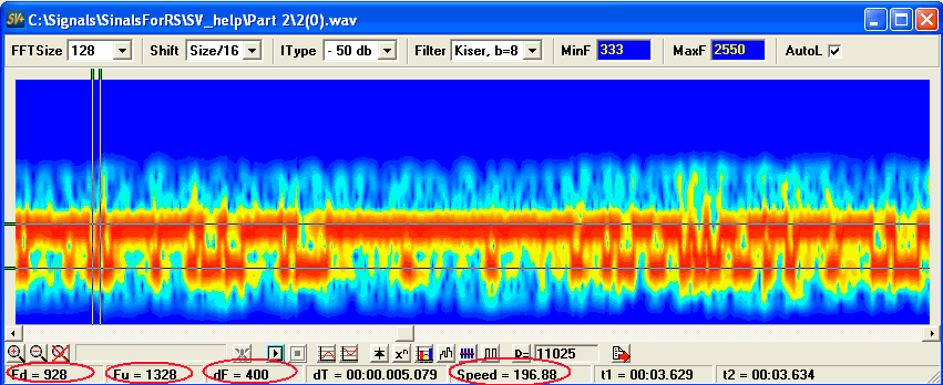 Ничего трудного, использована верхняя линейка настроек вьювера и "лупа"(с которыми все разобрались). Дальше маркерами можно измерить основные параметры, находим пару самых коротких переходов частот и ставим маркеры времени на середины этих переходов, считываем значение скорости, почему на середины? так в ряде случаев значительно точнее чем по фронтам. Маркеры частоты дадут разнос частот, частот самих две.