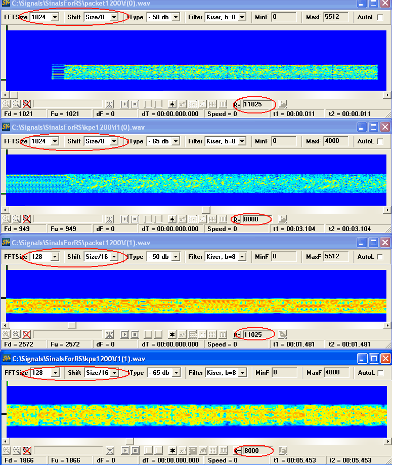 Чуть выше говорилось, что определить модуляцию можно на слух, на самом деле это не так, желающие убедиться в этом, могут попробовать сказать где FSK, а где PSK по этим записям -1- и -2-, дело в том, что оба эти вида модуляции есть суть манипуляций с частотой, кроме того с какого то предела скорости все становится шумоподобным не зависимо от вида. Давайте посмотрим чем может помочь в этом деле изучение спектра, и оставим эту тему "просто посмотреть" как полностью раскрытую. Очень часто при анализе, забывают/не знают/ленятся/ использовать весь комплекс подходов который предлагает собственно сам спектроанализатор. Возьмем эти же два файла(-1-,-2-), один Packet AX.25 1200, другой PSK-2 1200, спектрограммы такие: