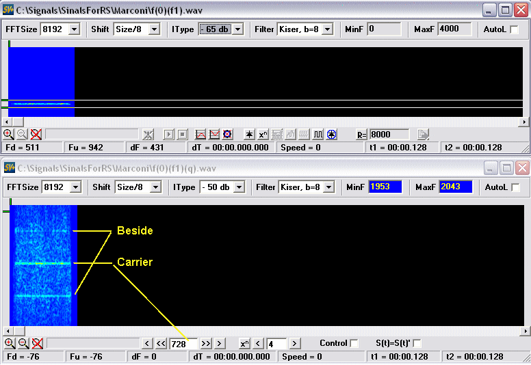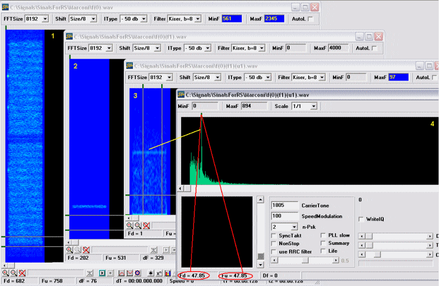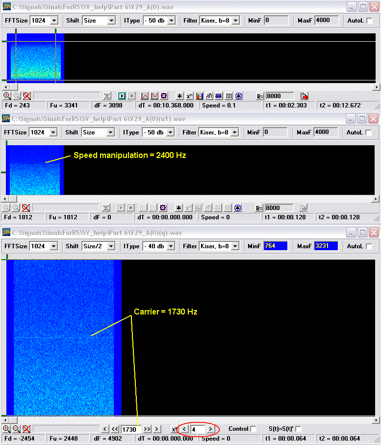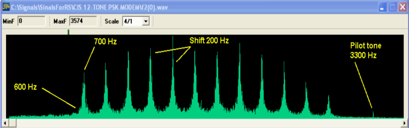 Как видим нет ни каких проблем с определением, нижний канал имеет несущую 728 Гц и модуляцию PSK-4, для выяснения точного разноса между каналами необходимо выделить следующий канал и определить несущую - 788 Гц, разность между двумя несущими и даст разнос между каналами и составляет 60 Гц, можно проверить, хотя это и не сильно точный метод, 26 частот с щагом 60 Гц, значит 60*25 даст полную полосу занимаемых частот от центра нижнего до центра верхнего канала и получаем 1500 Гц, что легко подтверждается. Для полного счастья нужно "прокрутить" один из выделенных каналов на фазовом вьювере, что бы удостовериться, что параметры определены верно, но это сами как нибудь, не так уж и сложно и подробно расписывалось. Все параметры определны, нет в этом ничего сложного, я думаю это очевидно.