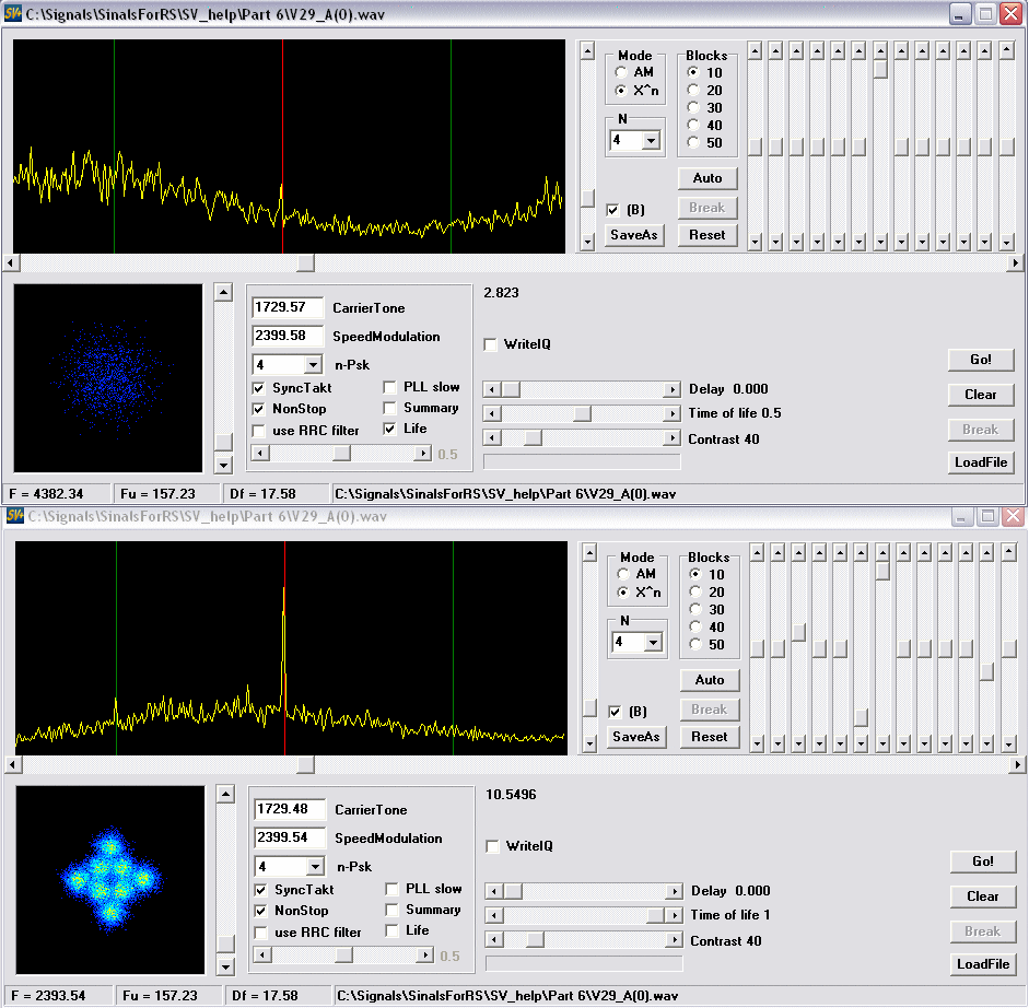 Рассмотрим использование Амплитудно-Фазового Корректора, в некторых случаях(не во всех разумеется) он позволяет "вытянуть" сигнал на качественно лучший уровень, в основном это касается PSK сигналов и иногда QAM-16. Ограничения в использовании АКФ в основном связаны со степенью искажений сигнала, часть искажений компенсируются легко, часть очень трудно и требуется ручное вмешательство, часть не компенсируется вообще. Также, АФК используется(более менее надежно работает) только для сигналов имеющих высокую скорость манипуляции, примерно за 500-600 Гц. В качестве примера возьмем довольно не простой, в смысле искажений, сигнал v.29 из приложения к статье.