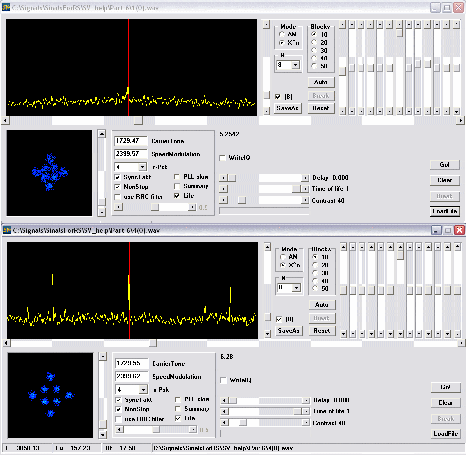 Сохраняем этот промежуточный результат в файл, например как 1.wav, открываем этот файл, загружаем его в этот же вьювер, сбрасываем настройки АФК(reset) запсускаем процесс отображения созвездия и уже выставляем в параметрах АФК восьмую степень сигнала(так как это точно не PSK-4) и повторяем весь процесс до получения ниалучшего результата, спешить не надо, лучше сохранять промежуточные результаты в файл, после трех-четырех "ходов" кнопкой Auto на файле 1.wav получаем примерно такое, а в конце концов можно добиться и практически отличного результата, как видим это после четвертого промежуточного результата.