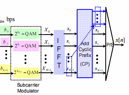 Немного повторимся, для формирования OFDM сигналов используются IFFT - Обратное Быстрое Фурье Преобразование, правильнее было бы сказать IDFT - Обратное Дискретное Фурье Преобразование, что в общем сути не меняет.