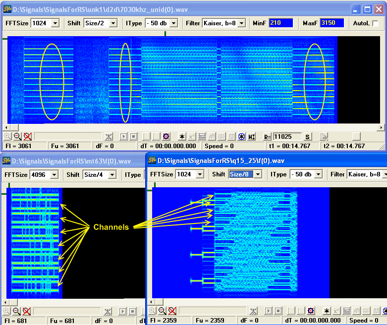 Где 0 это выключение частоты на очередном такте, а x - это текущее ее значение, фаза, амплитуда или и то и другое вместе(естественно на двух соседних тактах xx одинаковое), что автоматически обеспечивает разнос частот в два раза больше частоты манипуляции, и манипуляция в каждом канале происходит со сдвигом относительно соседних не на половину такта, а на такт, сама же рабочая посылка это два такта.