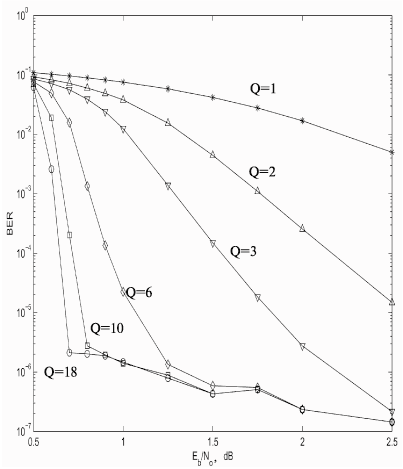 Рис. 4. Эффективность турбо-декодирования: результаты моделирования зависимости BER от Eb/No для различного числа итераций Q турбо-декодирования