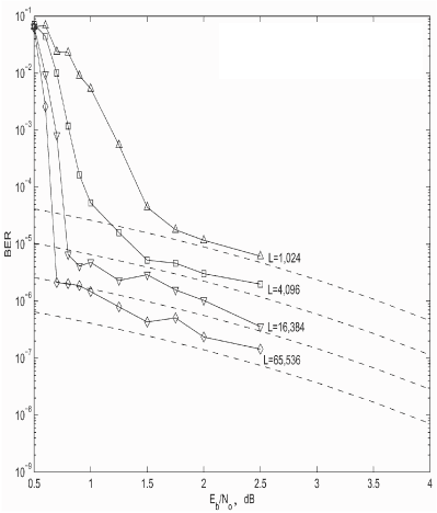Следует отметить две особенности в поведении кривых вероятности ошибочного декодирования при использовании ТК. Во-первых, анализируя рис. 4, можно обратить внимание на эффект достаточно низкой скорости спада вероятности ошибочного приема с ростом величины Eb/No. Более того, с чьей-то легкой руки в литературе по ТК этот эффект стали называть насыщением вероятности ошибки ("bit error rate floor"), хотя это, безусловно, не корректно. Как бы то ни было, этот эффект изучен и найдены асимптоты, к которым стремятся зависимости вероятности ошибки с ростом величины Eb/No. Эти асимптотические зависимости для различных длин перемежителя L приведены пунктирными линиями на рис. 5 [8], сплошными кривыми – результаты моделирования. По причине низкой скорости спада вероятности ошибки достигнуть очень малой ее величины, например BER=10-11, удается при чрезвычайно большой величине Eb/No даже при значительной длине перемежителя L=65536 и, соответственно, при значительном объеме памяти5. Иначе говоря, для такой низкой вероятности ошибки ТК оказываются неэффективны в сравнении, например, с каскадной схемой кодирования, принятой в стандартах DVB. Высокая эффективность ТК при малой величине Eb/No и снижение эффективности при ее увеличении имеют глубокие корни и объясняются упомянутым выше принципом, согласно которому основным критерием при выборе параметров кодера является минимизация числа кодовых слов с малым взаимным расстоянием, в противоположность принципу максимума минимального расстояния dmin между кодовыми словами. Поэтому при малой величине Eb/No ТК оказывается очень эффективным, однако с ростом Eb/No, когда главный вклад в вероятность ошибки начинают вносить кодовые блоки с малыми расстояниями от соседних кодовых блоков (малым d), прирост эффективности замедляется. Второй эффект, на который следует обратить внимание, анализируя кривые на рис. 4, — уменьшение эффективности итерационного декодирования с увеличением числа итераций Q с ростом величины Eb/No. Иначе говоря, чем больше эта величина, тем меньше требуется итераций при декодировании, поскольку схема итерационного декодирования становится ближе к оптимальной схеме.