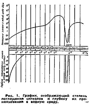 Надежное управление ПЛА в подводном положении представляет собой достаточно сложную проблему, над решением которой, как указывает зарубежная пресса, американские специалисты работают более 20 лет. Главная трудность заключается в том, чтобы радиосигнал преодолел толщу воды, где его энергия поглощается в зависимости от длины волны, а также удаления приемника от передатчика, его мощности, глубины приема сигналов, скорости перемещения антенны и ряда других факторов. Степень поглощения сигналов и глубина их проникновения в водную среду показаны на рис. 1.