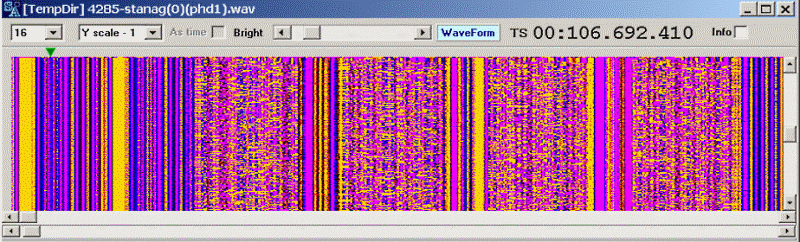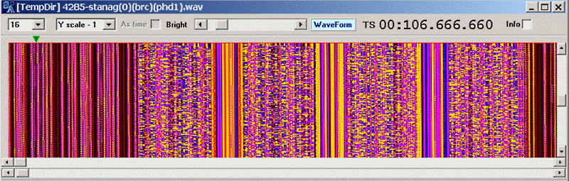 STANAG-4285 имеет тактовую частоту манипуляции 2400 Гц, длину фрейма в 256 символов. Период фреймов в таком случае равен (256/2400) = 106.6(6) мс. Фреймы отлично наблюдаются в модуле VMW, после фазового детектора.